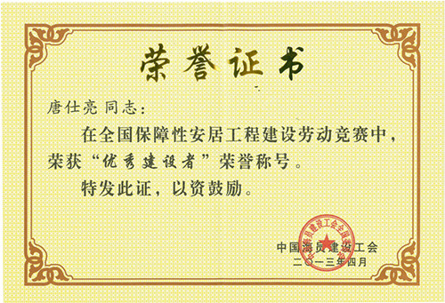 2013年4月,唐仕亮同志在由中國(guó)海員建工會(huì)舉辦的全國(guó)保障性安居工程建設(shè)勞動(dòng)競(jìng)賽中榮獲“優(yōu)秀建設(shè)者”的稱(chēng)號(hào)